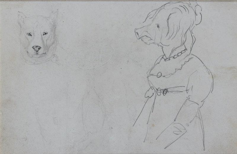Pencil, with sketches verso of a wolf and a woman’s body with the head of a pig