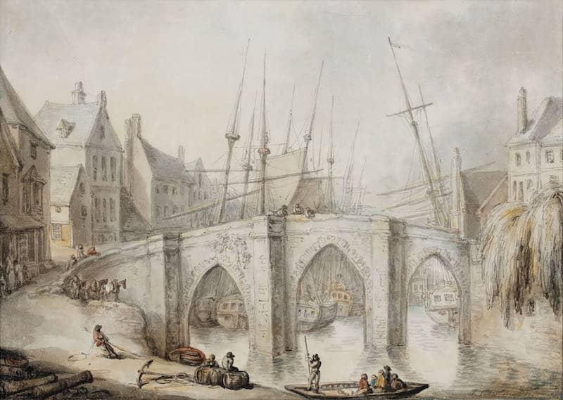A bridge over a river in a town, with shipping moored