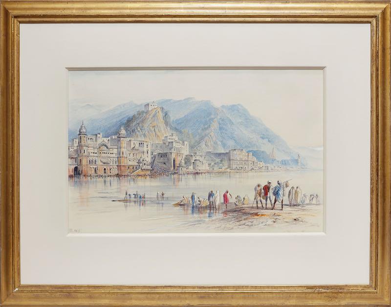 “The tall silver gray temples in shade, a side bit here and there catching bright light, are really beautiful, often half seen through a veil of light green or yellow foliage. …The colours of dresses amazing, women in apricot coloured shawls, rose coloured, scarlet, brown, all throwing flowers into the river.’….the mountains came out comparatively clear before lunch, so that I could really get an outline of the upper range, snows and all.’ He and his manservant Giorgio left Hardwar on 6 April.