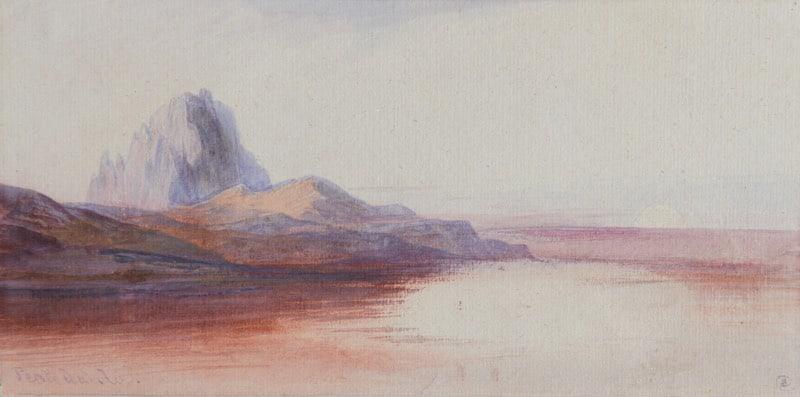 Lear’s close friendship of thirty-seven years with Tennyson inspired his ‘Painting=Sympathisations’, a proposed project of three hundred memories tied to three hundred poems, reflections of the relationship between painted word landscapes and written word paintings, described by Jasmine Jagger as open to a kind of synaesthesia. In her opinion, the finest examples of Lear’s poetrypainting can be found in the works he made of Pentedattilo. 1 Lear worked on the project on and off for thirty years, his drawings going through what he described as their egg, chrysalis and caterpillar stages. The final oil, or ‘butterfly’, of the painting of Pentedattilo was given by Lear to Tennyson’s oldest son Hallam and his bride Audrey as a wedding present, and was loved by the poet. Jagger suggests the present watercolour is the closest surviving version of this ‘butterfly’, with a distant speck of a hunched-over heron and its shadow replacing the figure seen in the multiple sketches of the subject. The lightly portrayed moon suggests the passage of time, and the dark lines over the sky have just faded. 2 The artist’s plan to illustrate Tennyson’s poems began to take shape in the summer of 1852, a couple of years after they met. Although their friendship had ups and downs, Lear’s affection for the poet’s wife, Emily, remained constant. Lear enjoyed selecting the lines of Tennyson’s poems on which to base his ‘Poetical Topographical’ project, and he began work on the scheme several times. In 1878 he finally got down to work in earnest, although the project was never completed, and Lear died with unfinished Tennyson canvases in his studio. Pentedattilo is an abandoned town in Calabria on Monte Calvario, a mountain whose shape once resembled that of five fingers: hence the name, from the Greek penta and daktylos (for five and fingers). It was badly damaged by an earthquake in 1783. Lear made a trip through southern Italy in 1847; his diary records his arrival on 30 July, at an elevated plateau whence the whole ‘Toe of Italy’ is finely discernible, a sea of undulating lines of varied forms down to the Mediterranean; a few towns glittered here and there, and towering over the southern extremity of land, a high cluster of rocks, the wild crags of Pentedátilo, particularly arrested our attention . 3