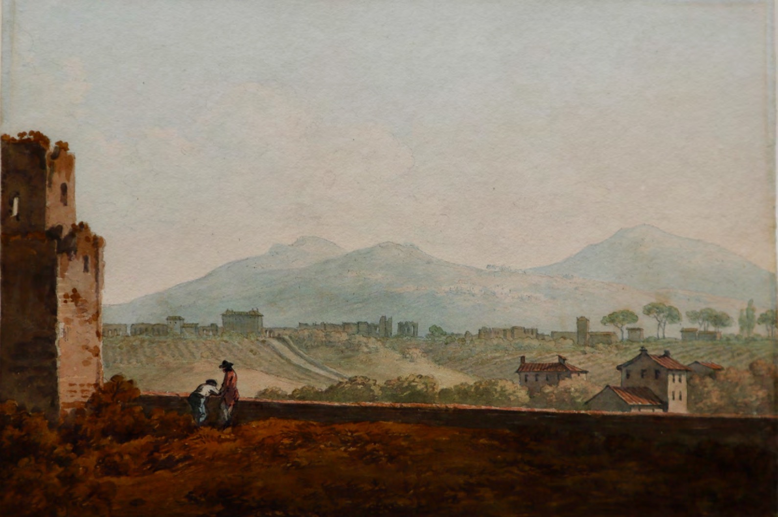 Watercolour over pencil, the original wash-line mount inscribed recto: View from the Gate of St John Lateran, Rome and signed, titled, inscribed and dated verso: I. Trevelyan 1795