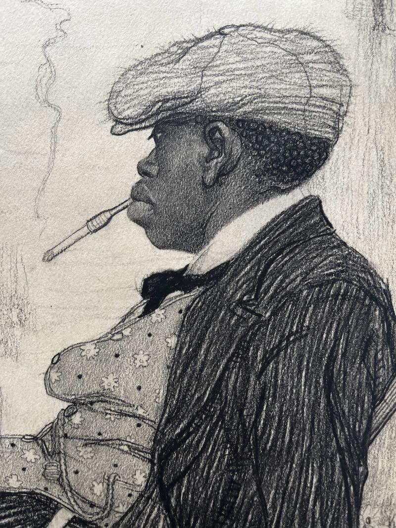 This striking drawing of a black family dates from 1918 and their smart appearance gives the work its title. The baby is elaborately swaddled and wears a complicated bonnet with a large bow. Its mother is stylishly dressed in a checked dress, wears lace at her throat, sports a fashionable dark hat with a feather and has expensive looking earrings and a broach at her neck. She holds an open parasol. The man who is the central figure in the composition swings on his chair and wears a smart striped suit, a patterned waistcoat with a watchchain and a fashionable Newsboy flat hat with a button, often worn for golfing, a cigarette holder balanced between his lips.