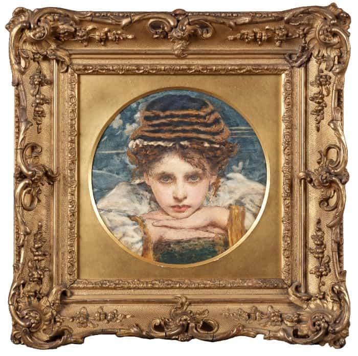 Mary Perrin specialised in intense watercolour portraits of female subjects, often drawing them with elaborate hats or coiffures. She also painted landscapes.