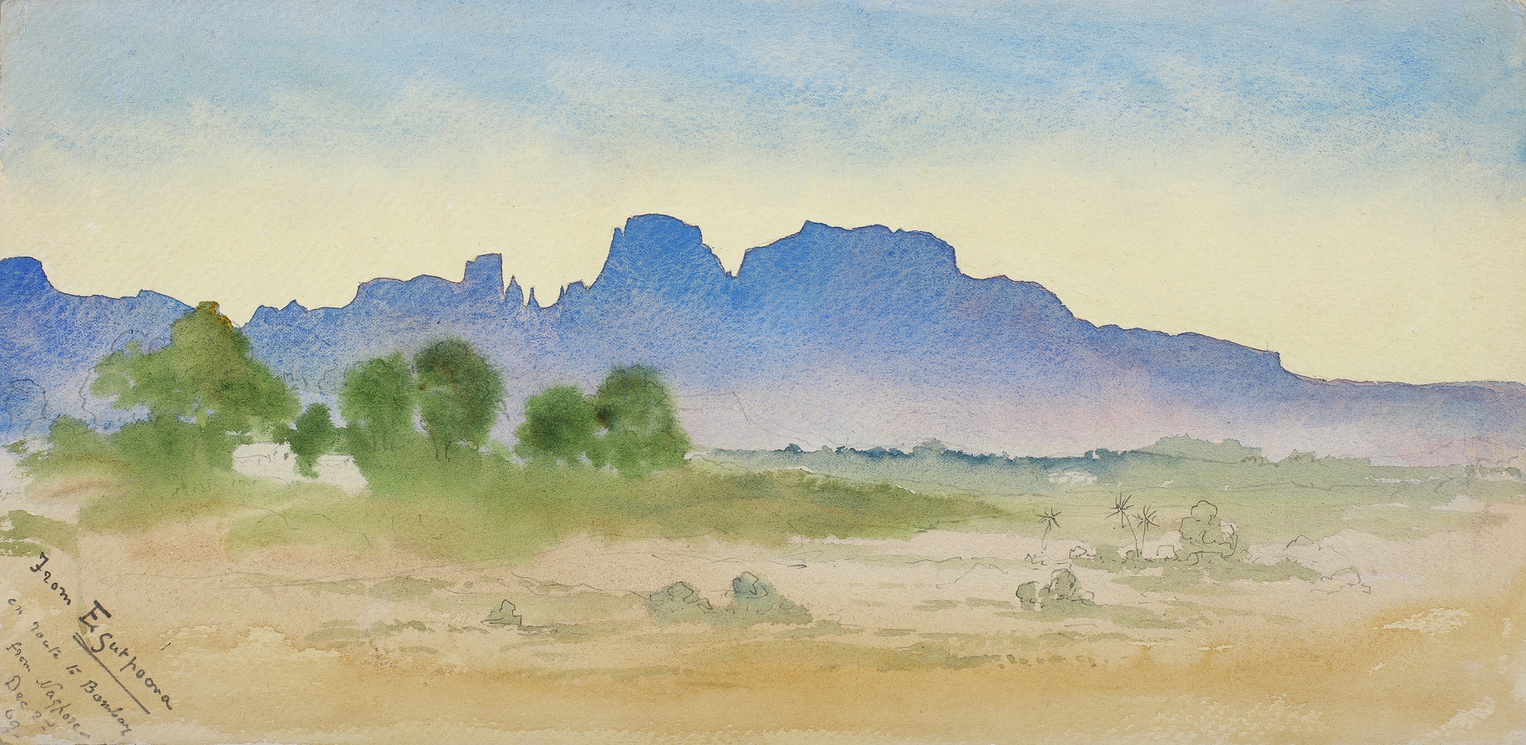 Inscribed and dated l.l.: From Egutpoora/en route to Bombay/from Nagpore/Dec 2nd/69, watercolour over pencil.
