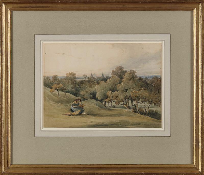 This charming view of London from Greenwich is painted from a similar vantage point to the artist’s famous self-portrait in Greenwich Park, in the collection of the Musée des Beaux-Arts, Calais (Inv.86-57-2). The towers of the hospital can be seen in the present drawing, with the dome of St Paul’s cathedral looming between them on the horizon.