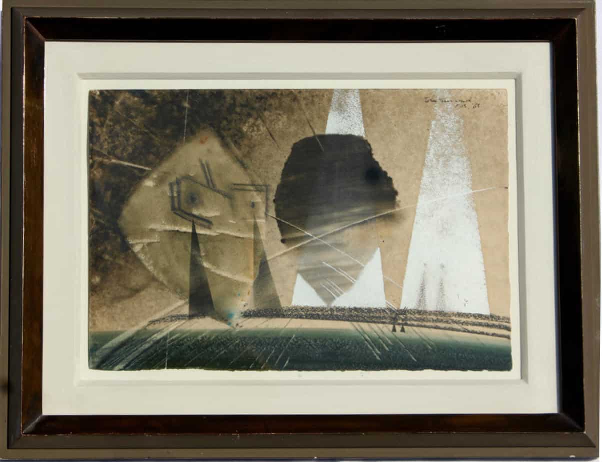 Peat and Whitton note that the artist's later painting had a more assured quality. Tunnard distilled his early mathematical precision and added a more atmospheric feeling, ‘this is most noted in the swiftly executed smaller gouaches'.