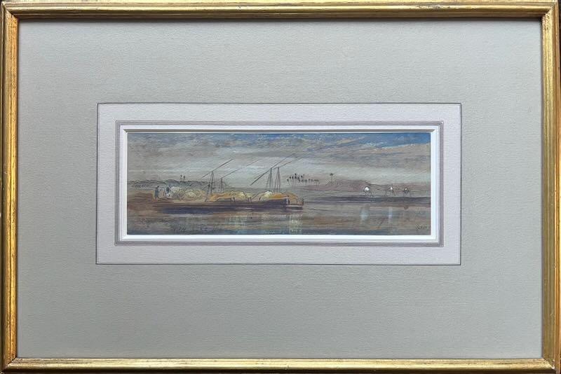 This watercolour dates from Lear’s second trip up the Nile and his third visit to Egypt in the winter of 1866-1867, when he travelled with his Canadian cousin, Archie Jones. The men met in Luxor and visited Esneh, Edfu and Denderah, and had reached Philae by the end of January. Lear found his cousin irritating due to his habit of whistling and his lack of enthusiasm for the temples.