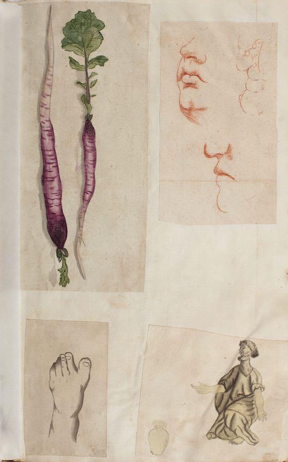 An album of early works including portraits, vegetables, flowers, studies of hands, feet and facial features, male figure studies drawn from life and spiders, c. 1772-3