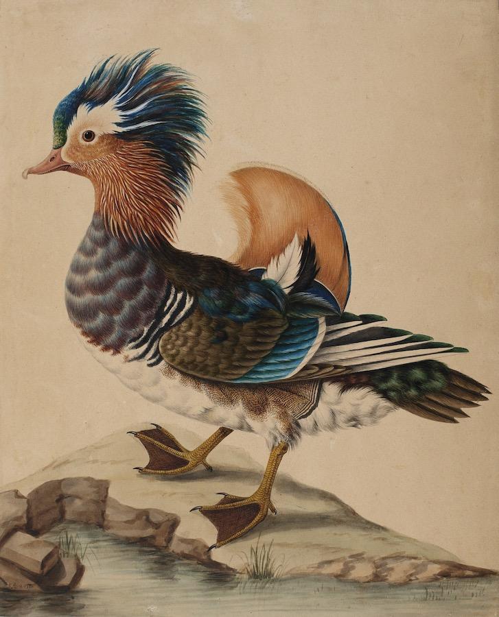 The Mandarin drake from China (Aix galericulata) is shown raising the fan-shaped, cinnamon coloured innermost pair of secondary wings on his back like sails in a courting gesture. Stone evidently admired the Mandarin duck as she made several versions of the present drawing. One is in the Natural History Museum, London (see Christine Jackson, Sarah Stone Natural Curiosities from the New Worlds, 1998, p. 113, NHML no. 54, ill. Pl. 54 p. 81). Another, smaller version dated 1781 (in poor condition) was sold at Bonhams, London, 12 October 2022, lot 3.